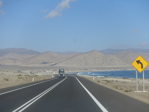 Sur la route 25, en début d'après-midi, le désert est toujours là mais la fraîcheur de l'océan se fait sentir, petit à petit. Nous arrivons aux abords de la deuxième plus grande cité du Chili : Antofagasta et ses 340 000 habitants. Nous décidons de poursuivre notre route sans y séjourner : la ville est réputée bondée et peu attractive, même si elle borde l'océan Pacifique. Nous contournons les faubourgs en reprenant, pour quelques dizaines de kilomètres, la fameuse Ruta 5 : la route Panaméricaine qui filoche, plein sud ! Une demi-heure plus tard, nous bifurquons sud-ouest sur la petite Ruta 1.